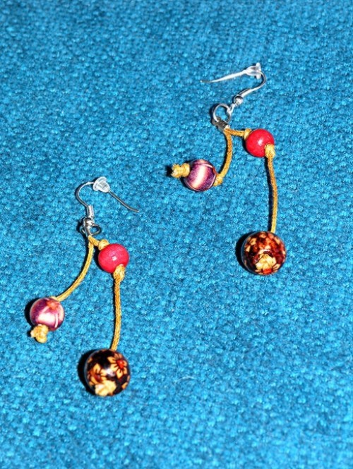 Brincos com fio encerado castanho, contas com flores e vermalhas. Níquel.